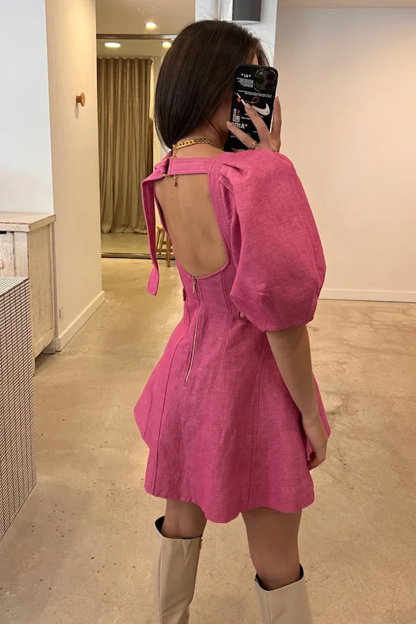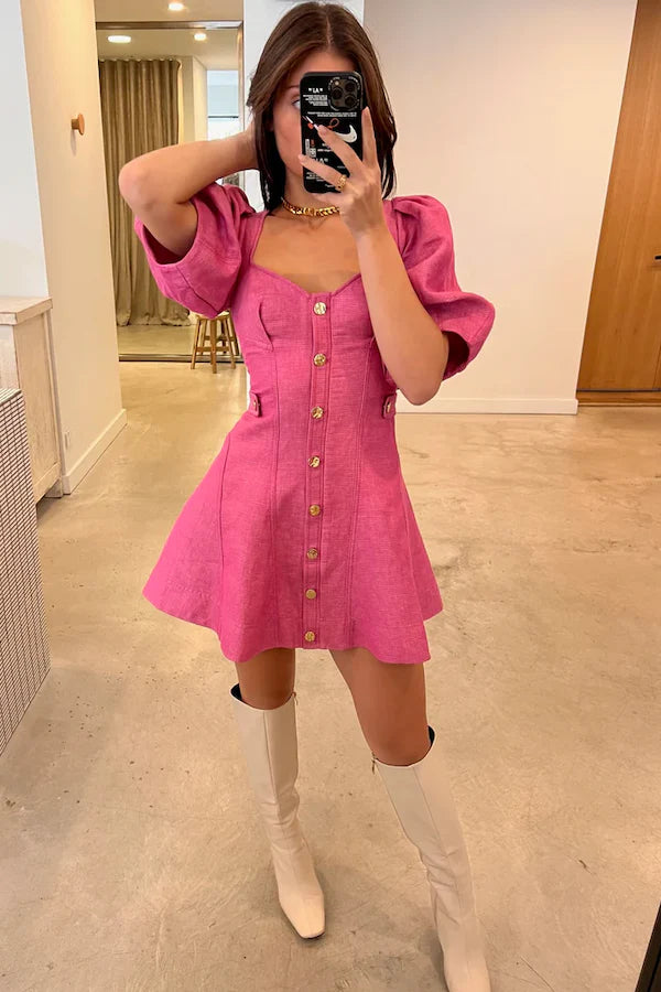 A reimagined take on the quintessential Acler denim silhouette. The Brookman Dress in Magenta is designed to be fitted through the bodice and flare toward the hem. Featuring a sweetheart neckline, luxe gold hardware, adjustable d-ring back bodice detail and accentuated sleeves.